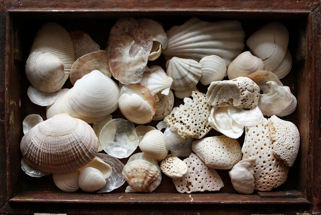Oh my, what wonderful collections. I especially like your old wooden boxes to contain them all. I actually have two wooden boxes of sea shells that look very similar to your shell collections. Small world. (I love this new direction for your work. Bravo.)